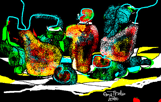 Desenhos a mão livre com lápis grafite e, com o mouse, trabalhados no MS PaintBrush e no Adobe PhotoShop.